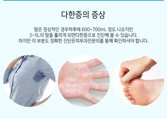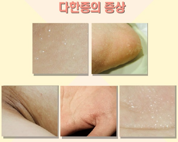 (1) 다한증의 주요 증상은 땀이 과도하게 분비되는 것입니다. 이는 다음과 같은 특징을 가집니다