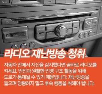 차량을 운전 중일 때 지진이 발생하면, 도로 한쪽에 차를 멈추고 안전벨트를 맨 채로 대기하는 것이 좋습니다. 다리나 고가도로 위에 있을 경우 즉시 안전한 곳으로 이동해야 합니다. 지진의 충격으로 인해 도로가 손상될 수 있으므로, 라디오를 통해 최신 정보를 확인하고 주변 상황에 주의를 기울여야 합니다. 지진이 멈춘 후에도 도로 상태를 확인하며 신중하게 운전하세요.