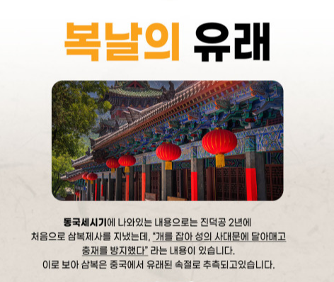 삼복더위는 중국의 '초복(初伏)', '중복(中伏)', '말복(末伏)'에서 유래되었다. 이는 음력으로 정해지며, 여름철 가장 더운 시기를 뜻합니다. 삼복은 대개 하지 이후 셋째 경일에 시작하며, 10일 간격으로 세 번의 복날이 돌아옵니다. 우리나라에서는 삼복더위 동안 다양한 전통 음식과 풍습이 존재하며, 이를 통해 더위를 이겨내고자 했습니다.