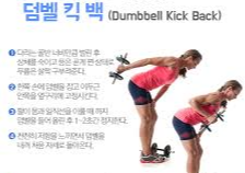 - 방법: 양손에 덤벨을 들고 상체를 앞으로 약간 숙입니다. 팔꿈치를 고정한 상태에서 팔을 뒤로 쭉 뻗었다가 천천히 원위치로 돌아옵니다.