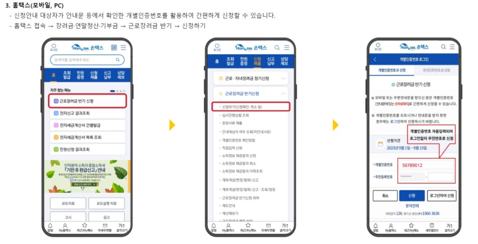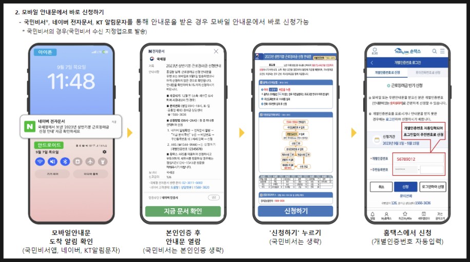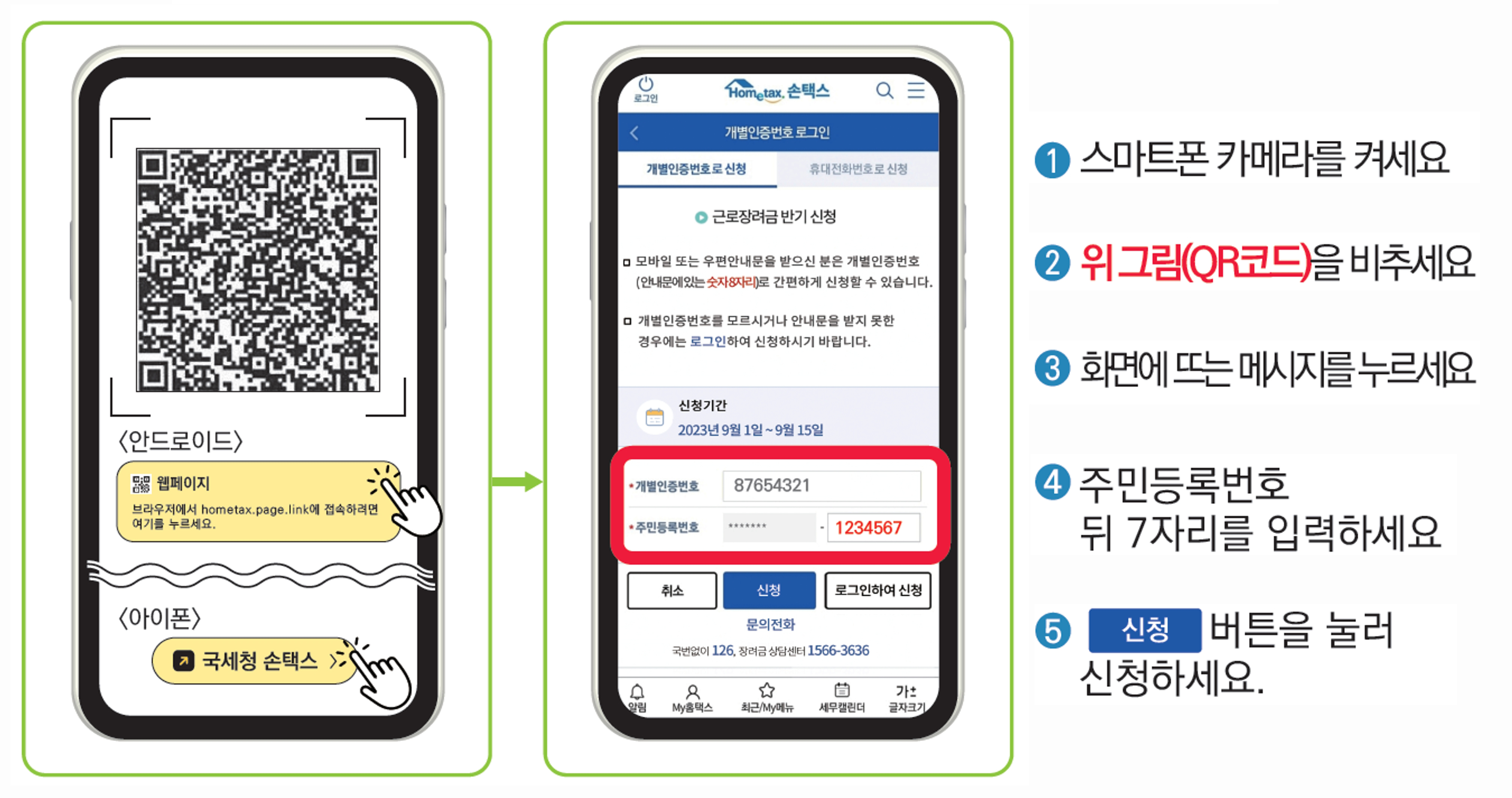 신청안내문에 있는 QR 코드 스캔 - 개별인증번호가 채워진 홈택스 모바일앱 신청화면으로 이동 - 로그인 없이 주민등록번호 7자리 입력 - 신청