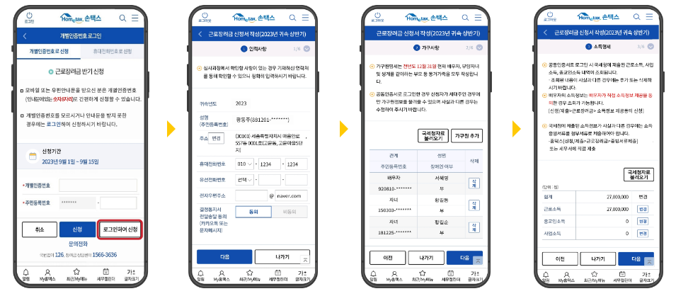 홈택스 →접속 장려금 · 연말정산 · 기부금 → 근로장려금 반기신청 →직접입력 신청 →신청요건 확인→ 인적사항 작성 → 소득명세 작성 → 전세명세금 작성 →계좌번호 및 연락처 작성 → 신청확인 및 전송
