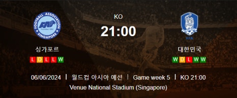 2024. 6월 6일 목요일 - 21:00 - 대한민국 v 싱가포르 (원정경기)