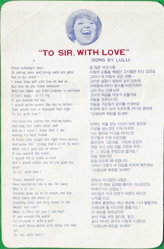 1967년에 국내에서 언제나 마음은 태양이라는 영화가 상영된 바 있는데 이 영화의 OST로 투 서 위드 러브(To Sir with love)가 주제가로 삽입되었습니다. 영화는 실화를 바탕으로 한 영화라고 하는데, 당시 실제로 선생님이었던 E.R 브레이스 웨이트의 자서전석 글을 바탕으로 만든 영화라고 합니다. 이 영화의 주제곡인 투 서 위드 러브(To Sir with love)를 부른 루루(LuLu)도 당시 영화에 출연하였었는데, 영화에서 이 곡을 불렀었고, 싱글로 발매된 이 곡은 빌보드 싱글 1위를 했던 곡입니다.