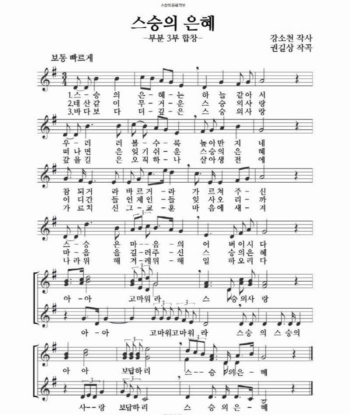 단출한 노래가사이지만 잘 따라 부르다가도 가끔 어머니 은혜의 후렴구와 혼동하여 부르곤 하는 어이없는 일도 있습니다.