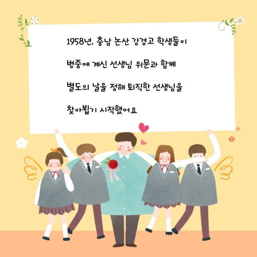 5월 15일은 대한민국의 기념일 중 하나로, 스승의 은혜에 보답하는 날입니다. 그런데 우리나라의 '스승의 날' 유래는 1958년 충남 강경여자중고등학교의 청소년적십자에서 시작되었습니다. 윤석란을 비롯한 청소년 적십자단원들은 병환 중에 계신 선생님 위문과 퇴직하신 스승님의 위문활동을 시작하였습니다. 이것이 계기가 되어 1963년 청소년적십자 중앙학생협의회에서 처음으로 5월 26일을 '은사의 날'로 정하였고 1965년에 한글을 창제하고 추앙받는 위인으로 일찍이 교육의 중요성을 깨닫고 백성에게 가르침을 주기 위한 임금이었기에 겨레의 위대한 스승이신 세종대왕 탄신일인 5월 15일을 '스승의 날'로 다시 정하고 기념하게 되었다고 전해집니다. 과거에는 스승의 날에는 재학생 및 졸업생들이 준비하는 스승의 날 행사가 성대하게 개최되었던 시절이 있었습니다. 그리고 어버이날과 마찬가지로 선생님께 꽃다발과 카네이션을 가슴에 달아드렸습니다.