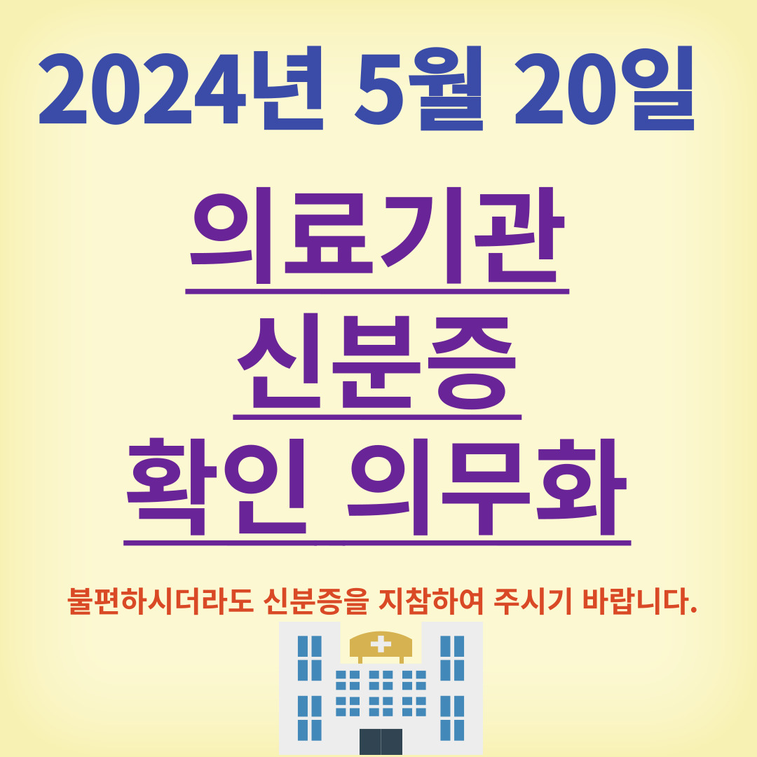이와 같이 국민건강보험법 개정에 따라 본인 확인 절차가 2024년 5월 20일부터 시행되오니 병원 내원 시 신분증을 반드시 지참하셔야 합니다. 피치 못할 사정으로 스마트폰으로도 본인 확인을 못한 경우에는 2주 안에 다시 병원에 내원하시어 본인 확인 완료 후 환급받으실 수 있습니 다. 타인의 신분증 또는 건강보험증을 도용 및 대여하시어 진료를 받으시는 경우 적발 시 2년 이하의 징역 또는 2천만 원 이하의 벌금에 처해질 수 있으므로 유념하시기 바랍니다.