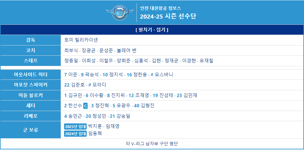 SSG는 대한항공 점보스 데이를 13일에 실시합니다. 대한항공의 곽승석과 김규민이 시구 및 시타에 참가하며, 이닝 간 이벤트를 통해 관람객들에게 대한항공 우승 기념 티셔츠 및 모자와 사인볼을 제공합니다. 인천 대한항공 점보스(Incheon Korean Air Jumbos)는 한국배구연맹에 속한 대한민국의 프로 배구단입니다. 모기업은 대한항공이며, 구단주는 조원태입니다. 1969년에 창단되었다가 석유 파동의 여파로 1972년에 잠시 해체하였고 그 이후 같은 그룹(한진) 학원인 인하대학이 야구부를 창단하자 이들 대학 선수를 처음 배출하는 1981년 실업야구팀을 창단할 예정이었으나 [1] 같은 해 말 프로야구 출범으로 무산됐다. 1986년에 재창단하였으며, 2005년 프로 팀으로 전환되어 지금의 팀명인 점보스를 쓰게 되었다. 연고지는 인천광역시이며 도원실내체육관을 홈구장으로 사용하였다가 인천 아시안 게임 개최를 위해 2013년 10월 7일 계양구 서운동에 새로 개관한 계양체육관으로 홈 코트를 이전했습니다.